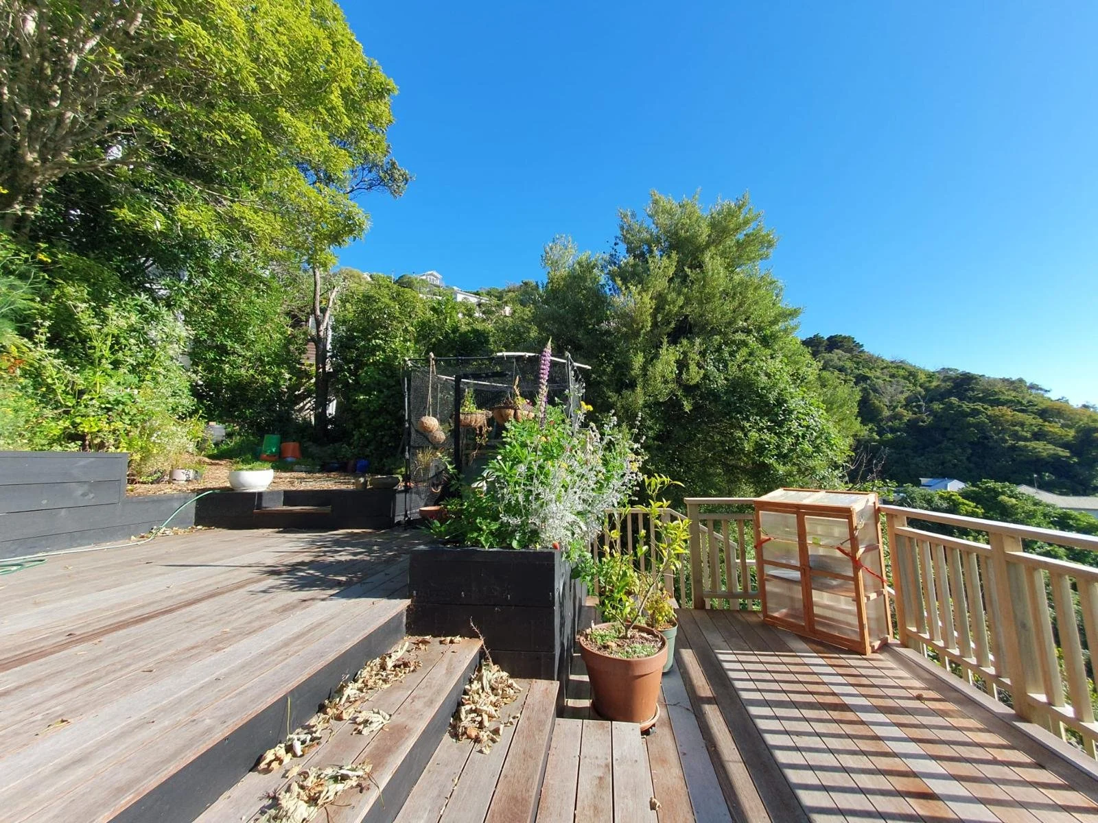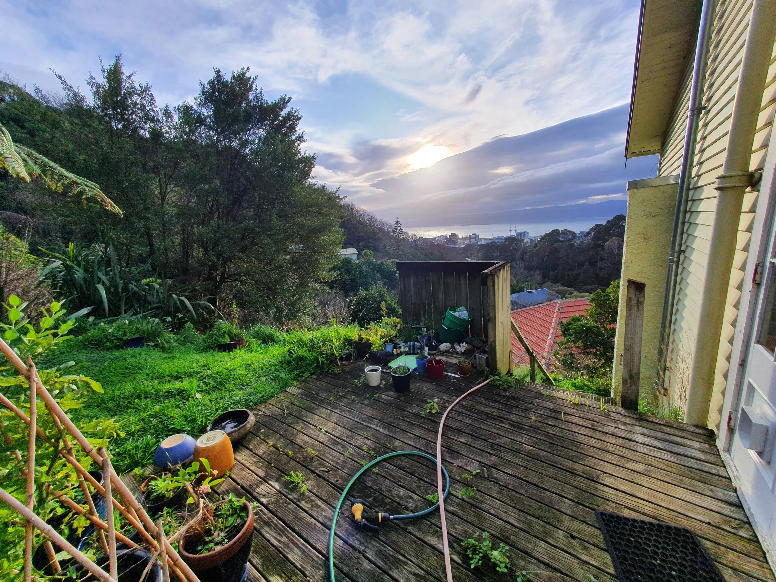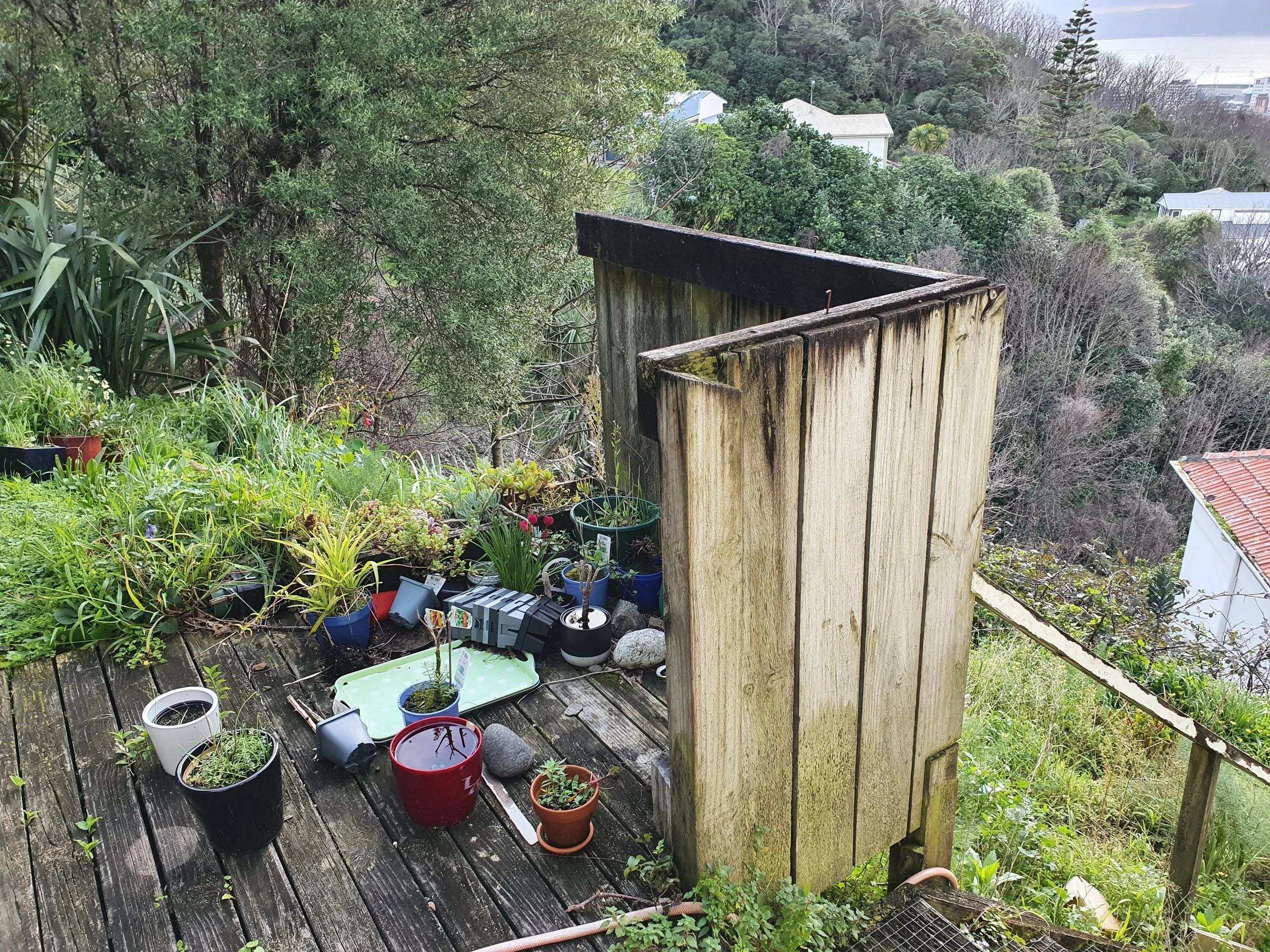 After descending from the road, Amie's house had retaining walls, an old deck, and a sheer drop to the houses below.